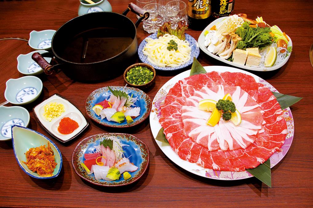 黒豚しゃぶしゃぶ、野菜、豆腐、キムチ、うどん。